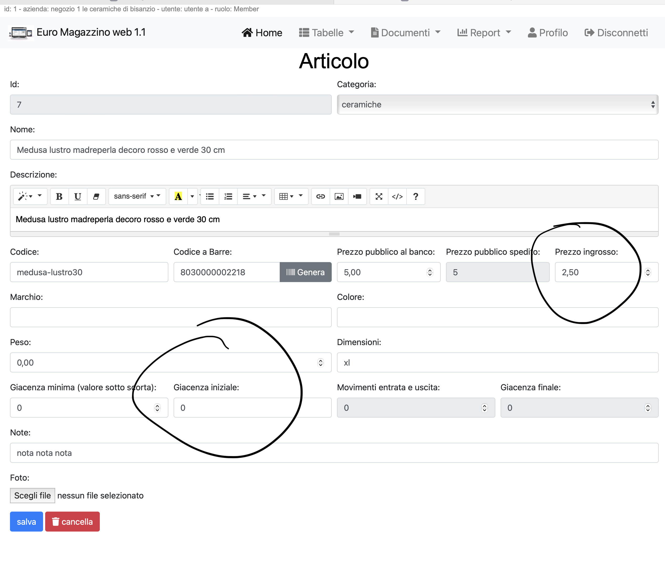 le informazioni raccolte devo essere riportate nel gestionale. nella fase iniziale consultando il seguente url: https://www.homeweb.it/euromagazzino/datatable-vista-a-g-v-m.php Articoli Giacenze Valore e Sotto Scorta si ha evidenza dei prodotti già caricati pertanto è sufficiente aggiornare il campo giacenza iniziale e il campo prezzo ingrosso.